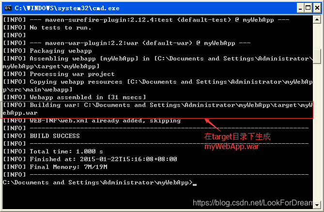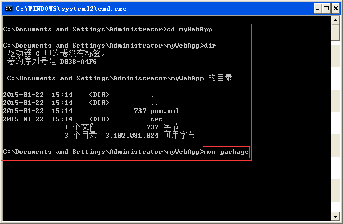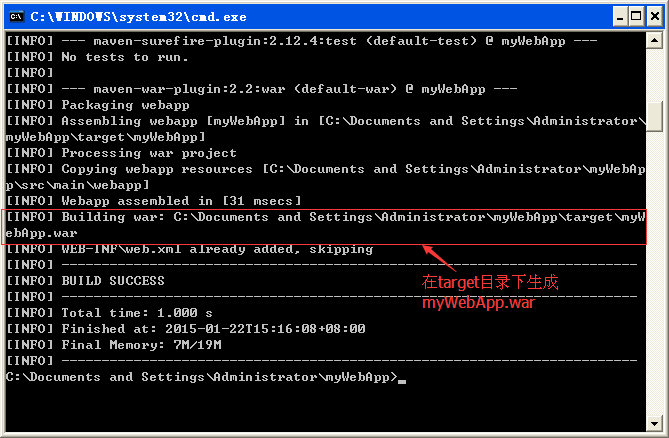 在命令行切换到myWebApp目录,执行:mvn package,构建成功后,myWebApp目录目录下多了一个target目录,在这个目录下会打包成myWebApp目录.war,把这个war包拷贝到Tomcat的发布目录下就可以运行了。如下图所示: