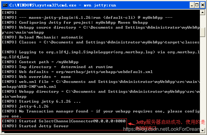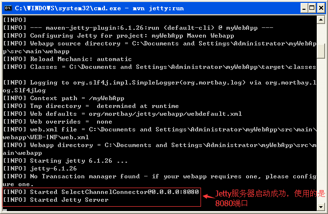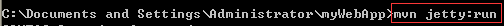 打开命令行窗口,切换到myWebApp目录,然后执行:mvn jetty:run启动Jetty服务器,如下图所示: