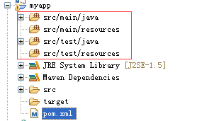 可以看到,Maven帮我们创建的项目是一个标准的Maven项目,不过目前Maven只是帮我们生成了src/main/java(存放项目的源代码)和src/test/java(存放测试源代码)这两个目录,但实际项目开发中我们一般都会有配置文件,例如log4j.properties,所以我们还需要手动创建src/main/resources(存放项目开发中用到的配置文件,如存放log4j.properties等)和src/test/resources(存放测试时用到的配置文件),如下图所示: