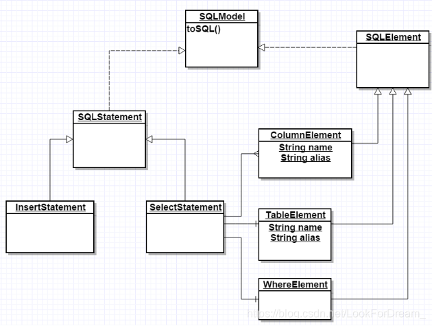 select和from是特定关键字,用字符串记录在SelectStatement即可,Columns、Table、Where、GroupBy、SortBy都是SQL元素(SQLElement),明显的,和SQL语句有相似性又有所不同。这里提出一个更加抽象的概念SQL模型(SQLModel)。使SQLStatement\SQLElement implementsSQLModel。