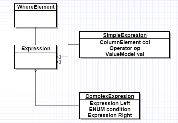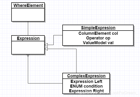解答,我们可以把 A AND B OR C视为 Exp1 = A AND B,Exp2= Exp1 OR C。综上,我们可以大概得出WhereElement的设计如下: