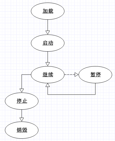 其中,加载、启动、停止、销毁,在整个生命周期中,只会执行一次。而继续态会多次出现(可以考虑是根据帧率来不断提出继续请求),主动发起暂停请求的时候,才会进入暂停态。
