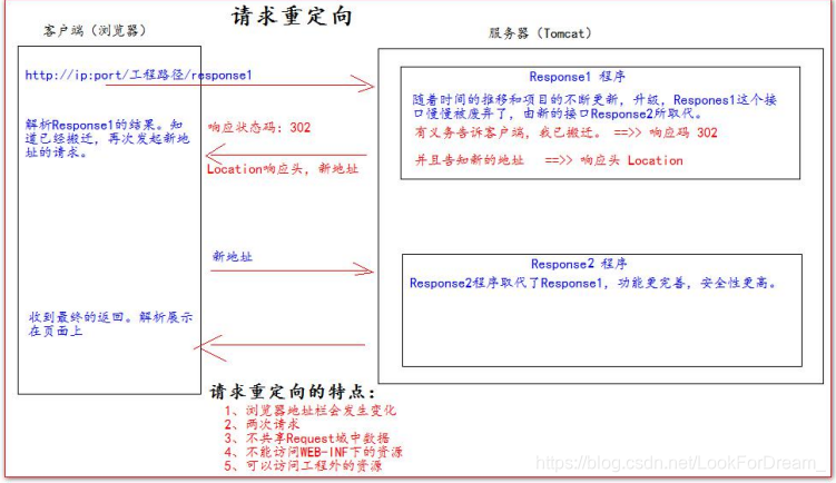 请求重定向,是指客户端给服务器发请求,然后服务器告诉客户端说。我给你一些地址。你去新地址访问。叫请求 重定向(因为之前的地址可能已经被废弃)。