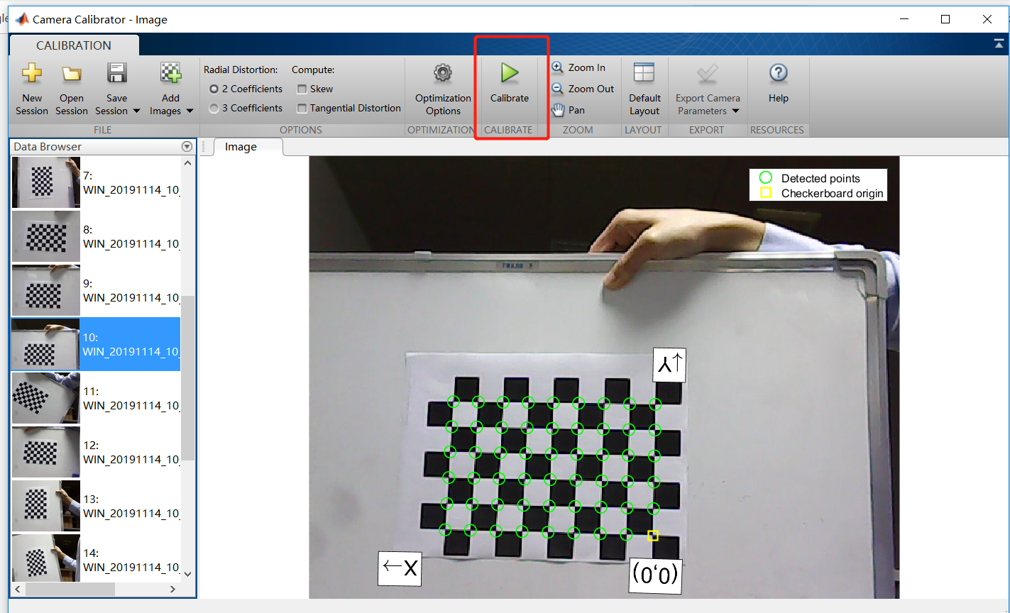 然后可以看到自动标出了x,y轴,和圈出了方角。下一步点击Calibrator