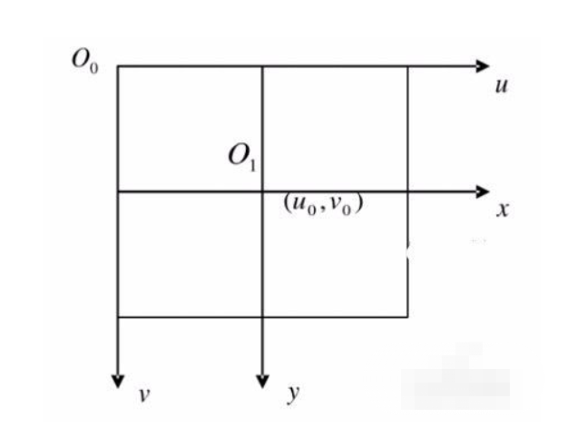 在二维成像平面坐标系中,相机光轴与图像平面的交点即为原点,该点称为图像的主点,如果我们不去考虑畸变,图像的主点就是图像的中心点,但是由于相机系统加工,外力作用等原因会产生一定的偏移。设主点在像素坐标系中的坐标为,则像素坐标系与成像坐标系对应关系如下:
