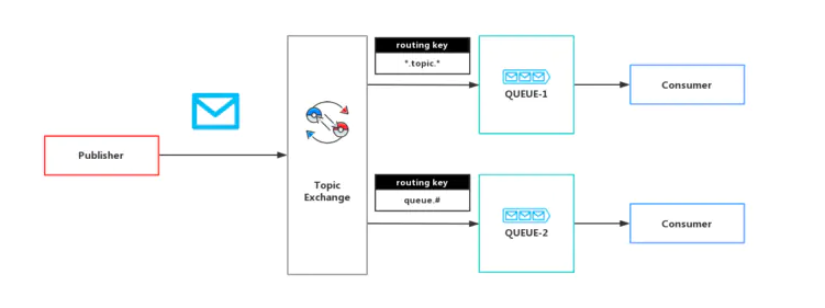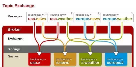 如图所示,发送到 topic exchange 的消息,会通过消息的 routing key 模糊匹配再路由:
