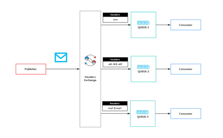 不处理路由键。而是根据发送的消息内容中的headers属性进行匹配。在绑定Queue与Exchange时指定一组键值对;当消息发送到RabbitMQ时会取到该消息的headers与Exchange绑定时指定的键值对进行匹配;如果完全匹配则消息会路由到该队列,否则不会路由到该队列。headers属性是一个键值对,可以是Hashtable,键值对的值可以是任何类型。而fanout,direct,topic 的路由键都需要要字符串形式的。