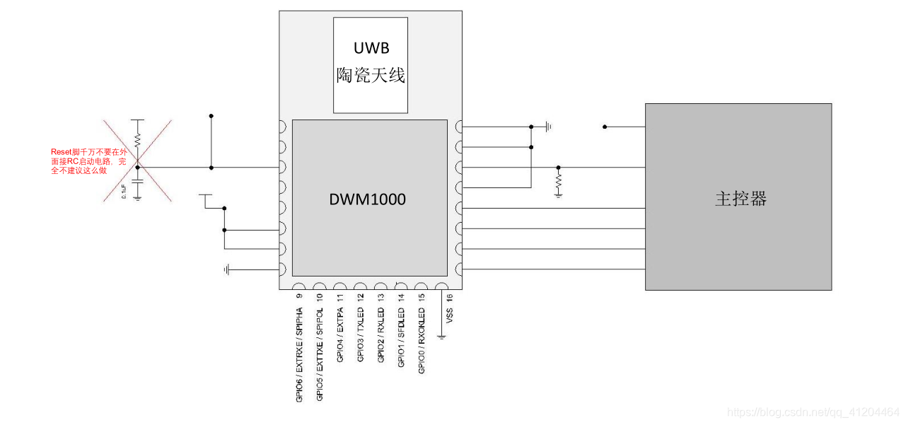 一个简单的集成 DWM1000 的应用电路是只需要供电给 DWM1000,并连接模块到一个主控器(单片机)参照下图。