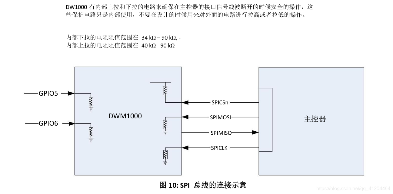 建议的用于上拉 GPIO 5 / 6 的电阻范围是 1-10 kΩ. 如果某些情况下要求下拉 GPIO 5 / 6 到地, 而同时又需要作为高电平信号被外部的芯片识别,这个电阻值的选择必须同时也要计算 DW1000 的内部下拉电阻值才能得到期望的效果。