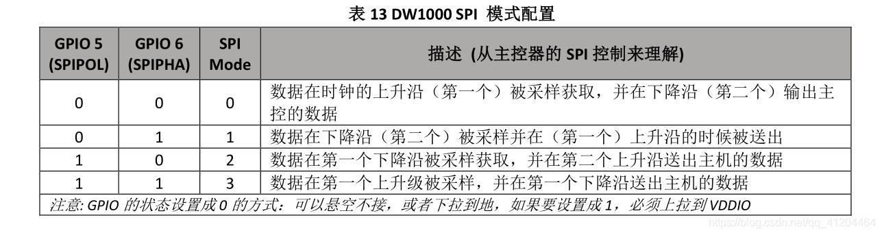 SPI 接口支持多种 SPI 的时钟极性和时钟/数据解析模式操作。这些模式使用 GPIO5 & 6 如下图所示: