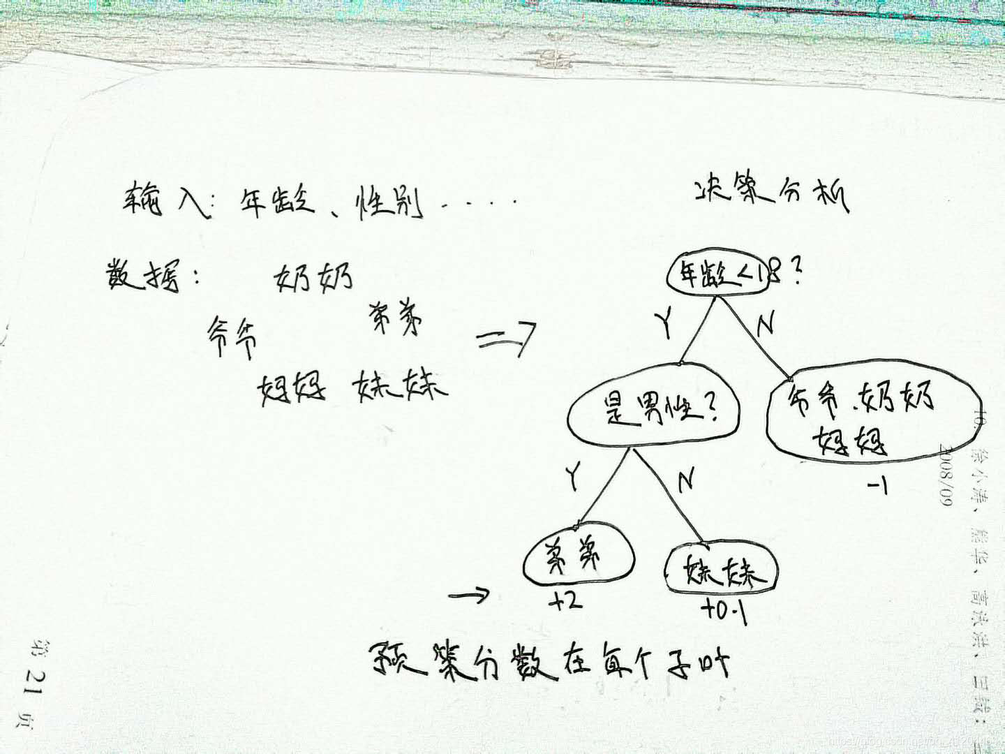 如图所示,根据一些 feature(特征) 进行分类,每个节点提一个问题,通过判断,将数据分为两类,再继续提问。这些问题是根据已有数据学习出来的,再投入新数据的时候,就可以根据这棵树上的问题,将数据划分到合适的叶子上。