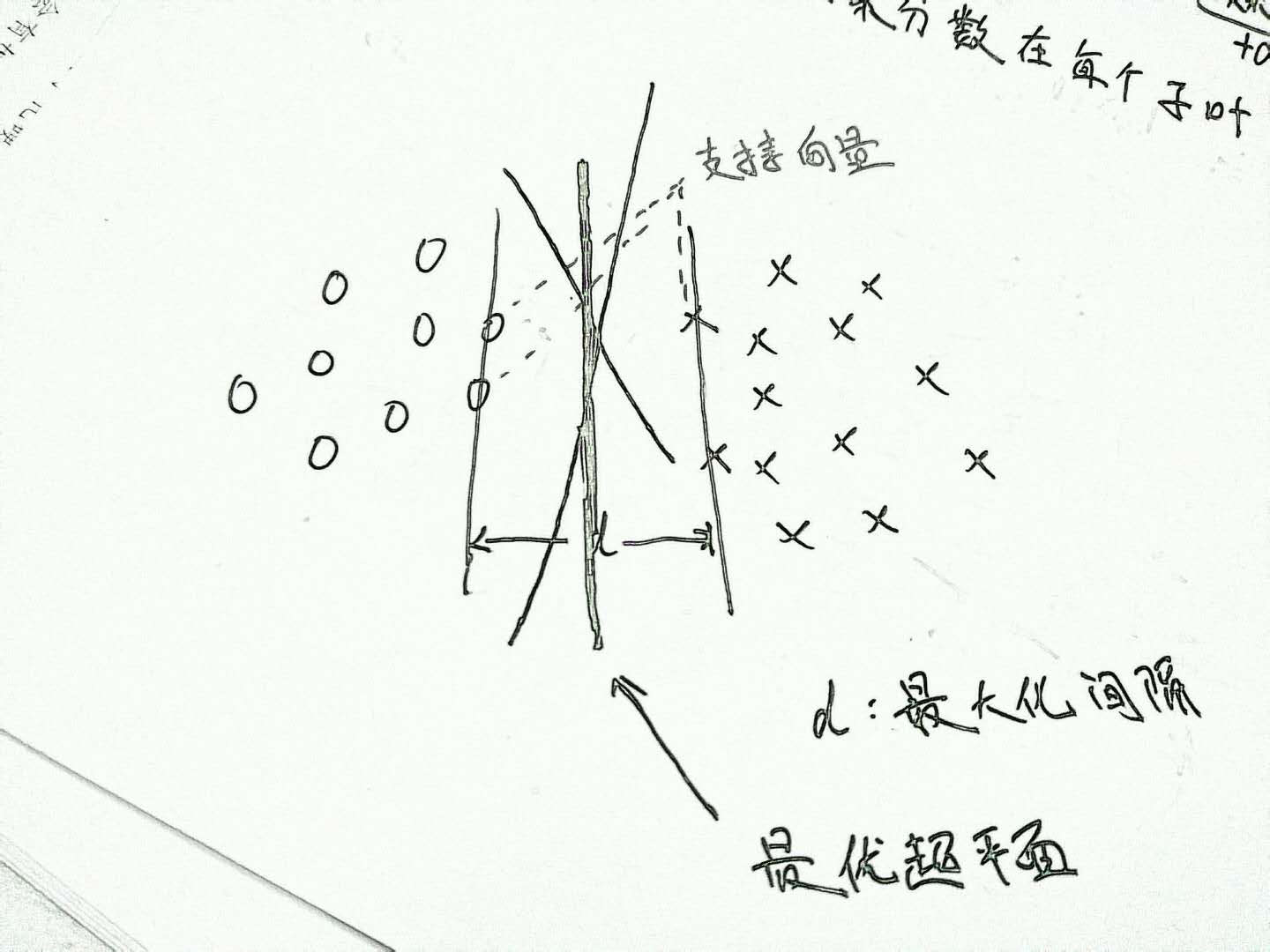 在分开数据的超平面的两边建有两个互相平行的超平面,分隔超平面使两个平行超平面的距离最大化。假定平行超平面间的距离或差距越大,分类器的总误差越小。