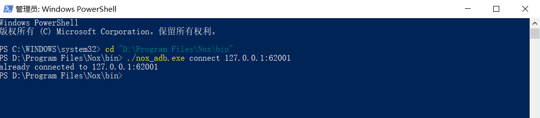 3.执行命令:./nox_adb.exe connect 127.0.0.1:62001 连接到模拟器;