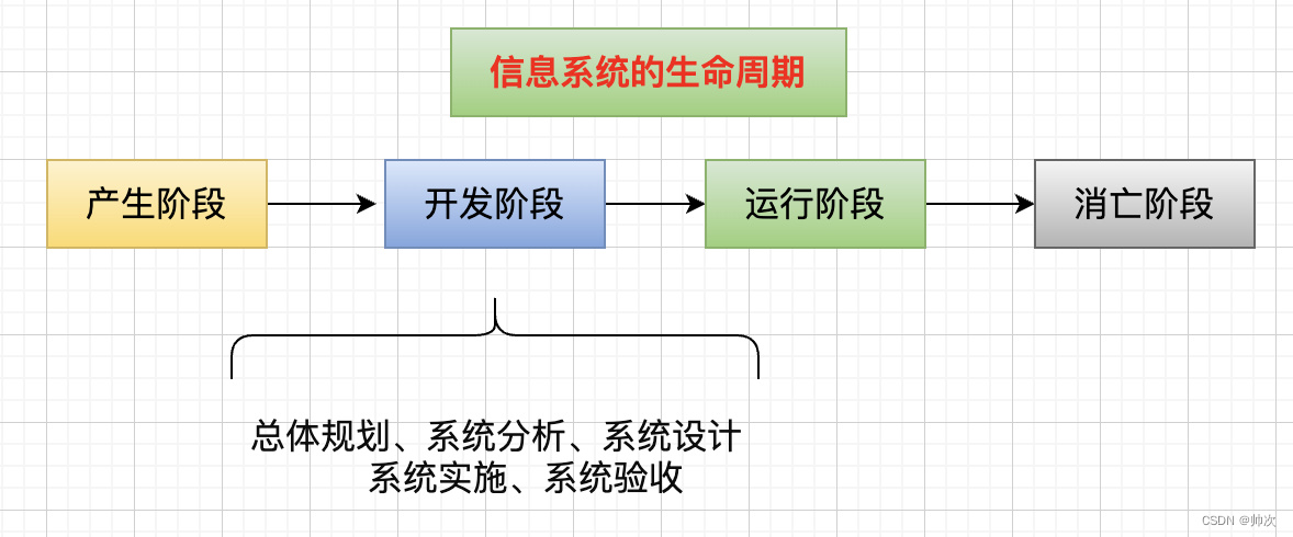 2.信息系统的开发阶段:最重要、关键的阶段。包括总体规划、系统分析、系统设计、系统实施和系统验收这5个阶段。