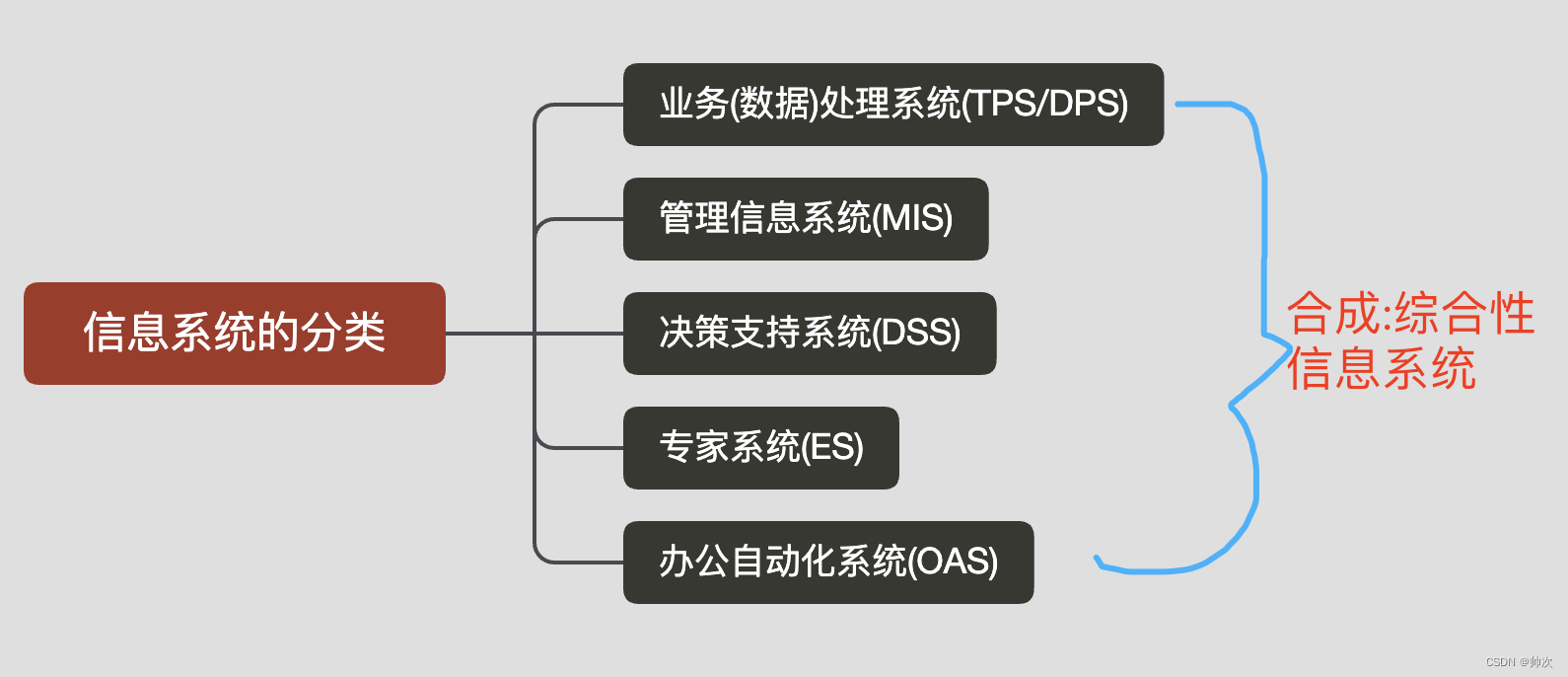 6.综合性信息系统:信息系统之间的关系并不是取代关系,而是互相促进、共同发展的关系。在一个企业里以上5个类型的信息系统,可能同时都存在,也可能只有其中的1种、2种或3种。更高级的是几种信息系统互相融合成一体。同时,以上这5种信息系统本身也是与时俱进发展的,不断有新的技术、新的方法和新的工具融入其中。