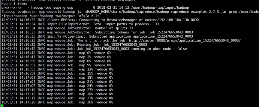 运行 hadoop 安装包中 自带的 mapreduce 正则匹配例子。