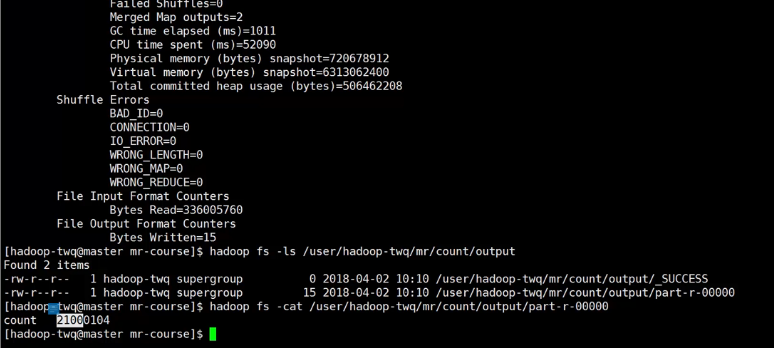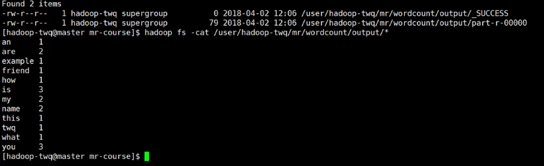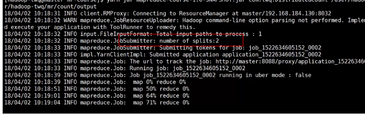 hadoop jar mapreduce-wordcount.jar com.dzx.hadoopdemo.mapred.WordCount /user/hadoop-twq/mr/count/input/big_word.txt /user/hadoop-twq/mr/count/output