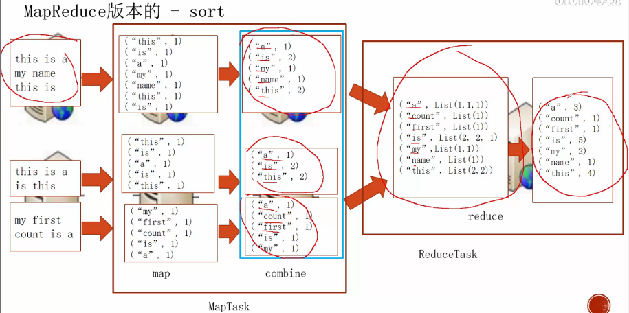 如图可看到,在maptask的 combine 阶段会将 map的结果按照 key 的 字母自然顺序进行排序。