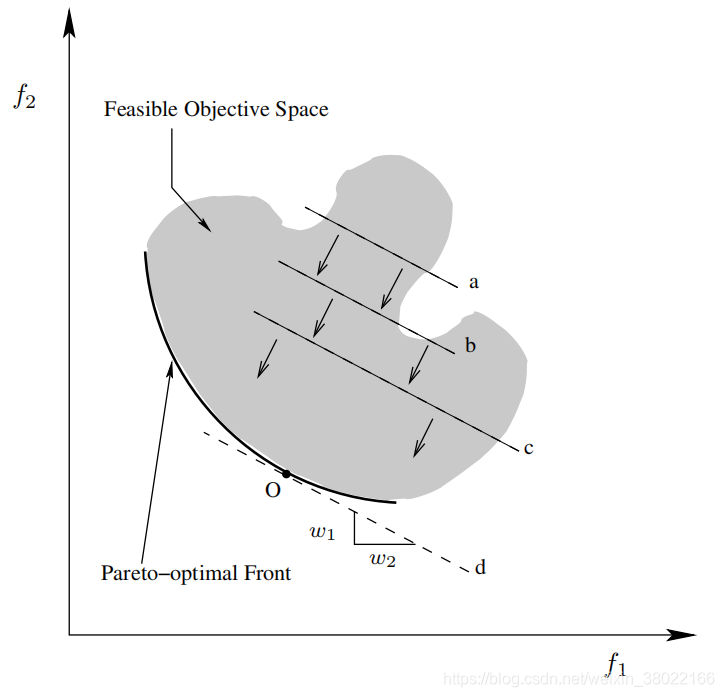 和平面的方向由加权值Wi决定。在有两个目标的特殊情况下,gWS将采用直线的形式,其中斜率由权重向量确定,如图: