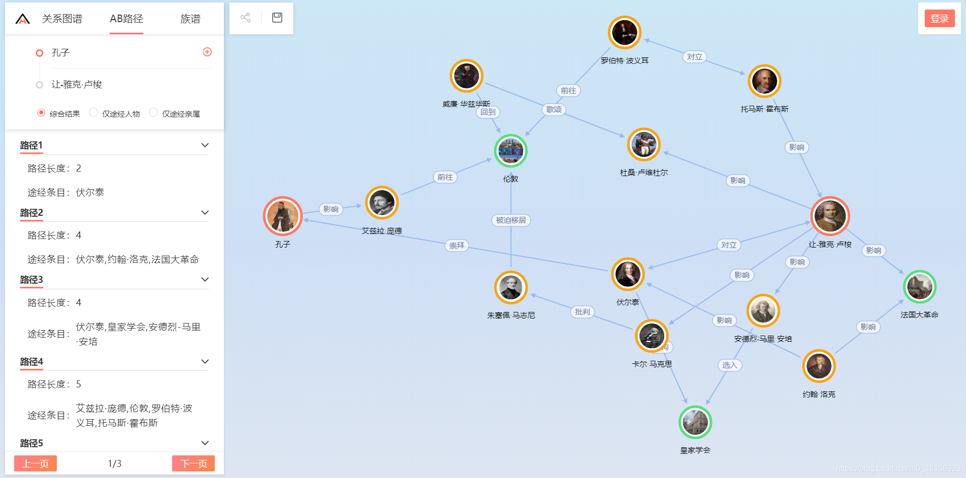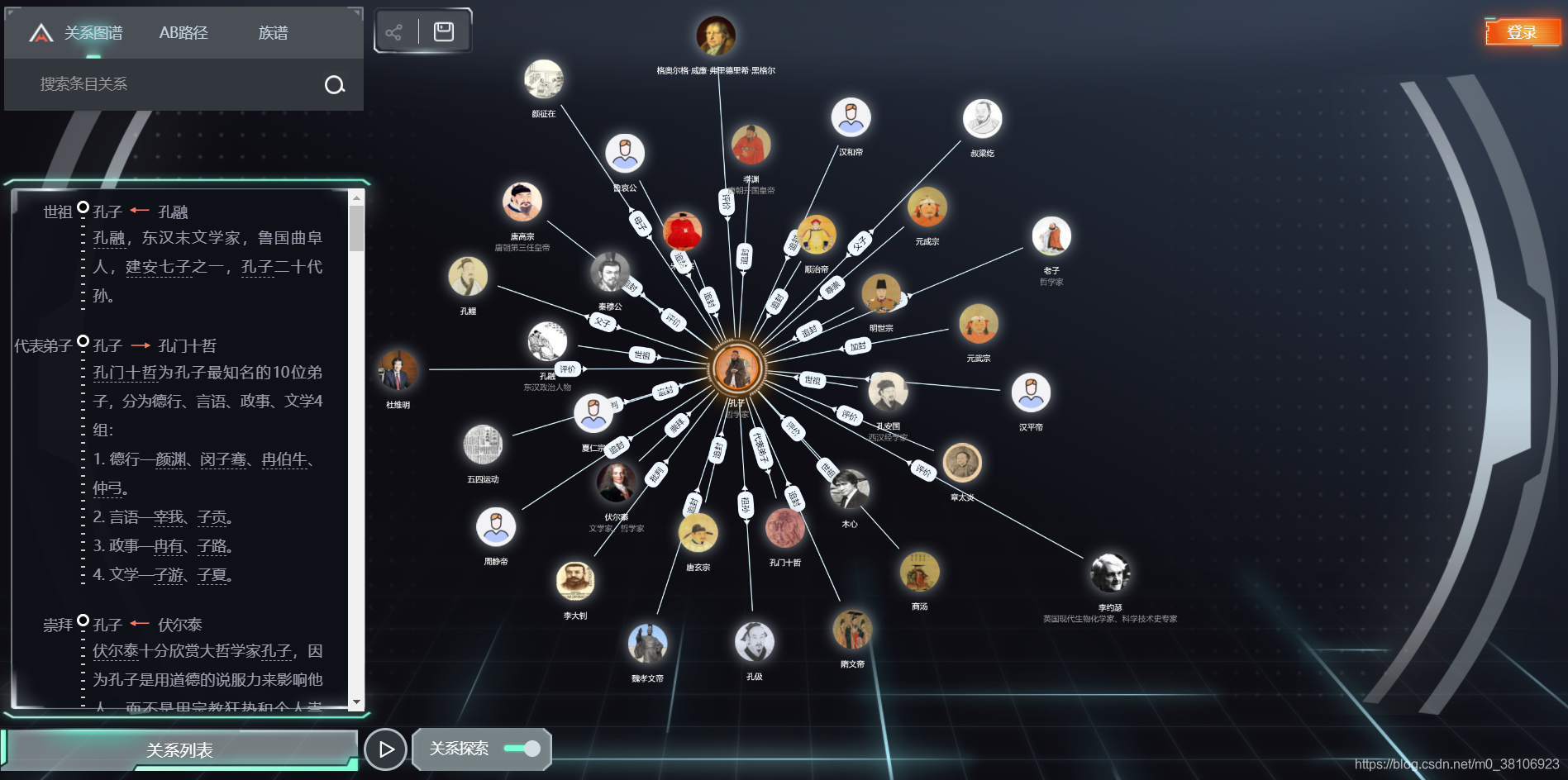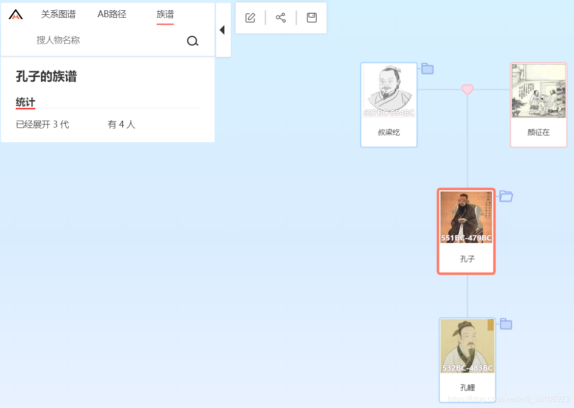 该历史网站支持关系图谱功能,一张图谱, 玩转万物。爱恨情仇、丰功伟绩、大国争霸、外交斡旋,尽在浩瀚的历史星空之中,单点发散,多点链接,宛如遨游星座,自由探索未知的可能。例如输入孔子,可通过知识图谱,查看其关系图谱、AB路径和族谱关系: