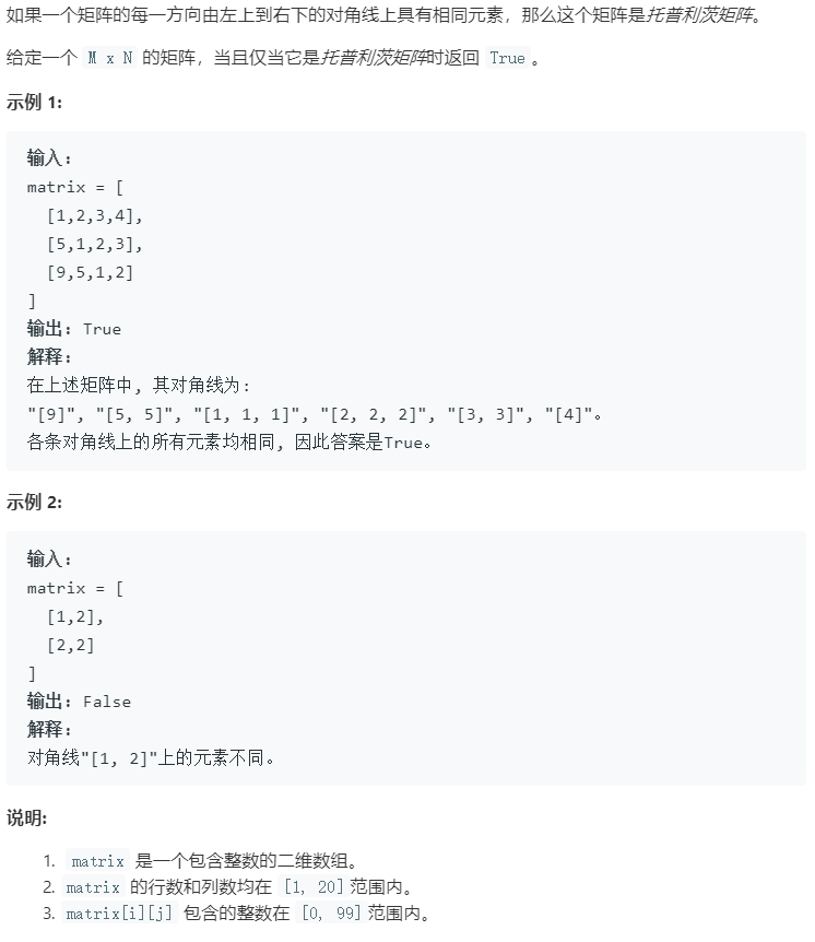 bool isToeplitzMatrix(int** matrix, int matrixSize, int* matrixColSize){