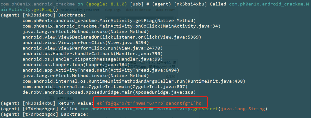 android hooking watch class_method com.ph0en1x.android_c rackme.MainActivity.getFlag --dump-args --dump-backtrace --dump-return