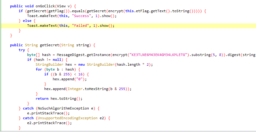 getSecret(getFlag()).equals(getSecret(encrypt(this.etFlag.getText().toString())))