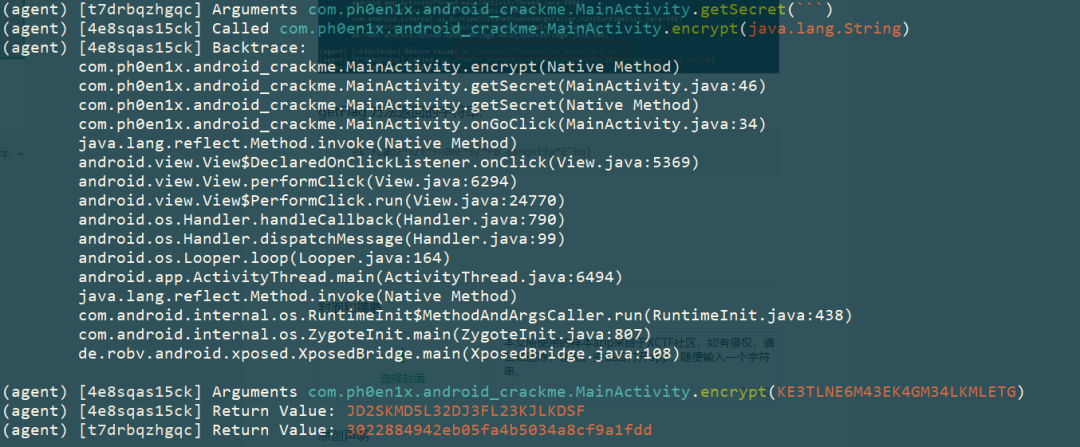 android hooking watch class_method com.ph0en1x.android_c rackme.MainActivity.getSecret --dump-args --dump-backtrace --dump-return