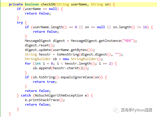 这段代码很容易理解,对username进行MD5加密,并换转为字符串,取出偶数位的字符,再与注册码进行比较,如果相等返回true,否则返回false。