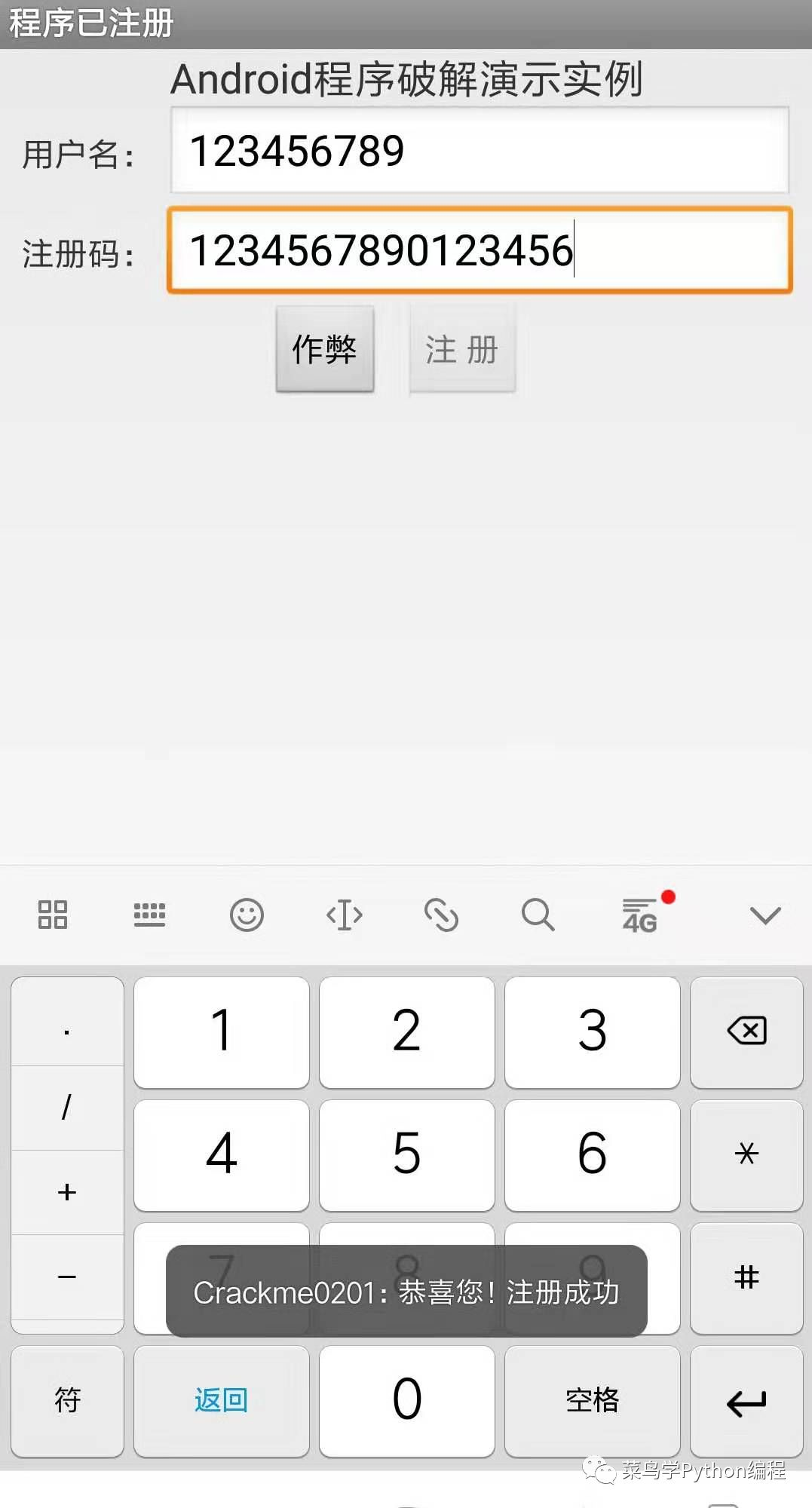 显示注册成功,怎么样,是不是非常的简单方便,既不用修改smali代码,也不用重新编译安装,简直不要太省事。