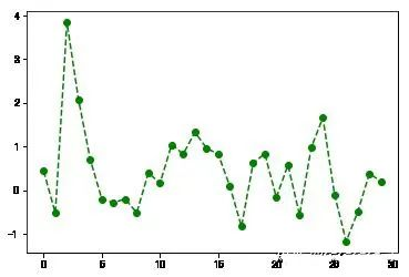 plt.plot(np.random.randn(30),color='g',linestyle='--',marker='o')