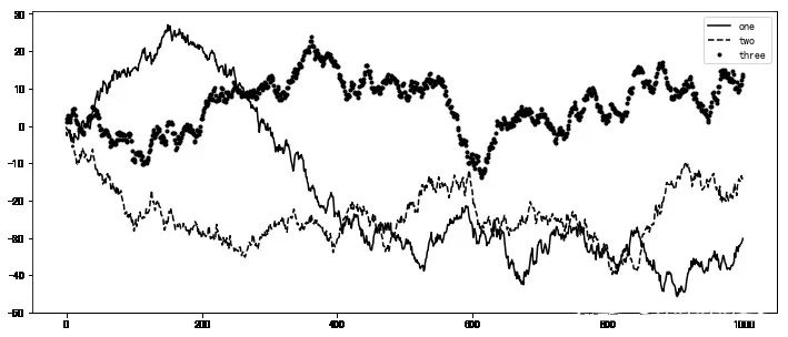 ax.plot(np.random.randn(1000).cumsum(),'k',label='one') #传入label参数,定义label名称