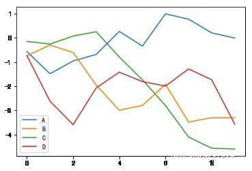 df = pd.DataFrame(np.random.randn(10,4).cumsum(0),columns=['A','B','C','D'])