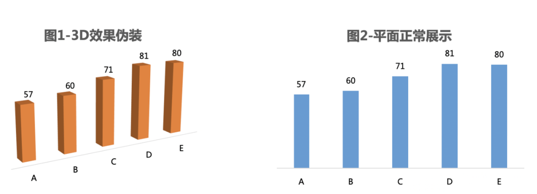 3D效果的伪装:3D图形容易造成视觉偏差,如图1有3D效果,看上去 A->B->C->D->E依次递增,实际是D>E,要格外小心图表的伪装。