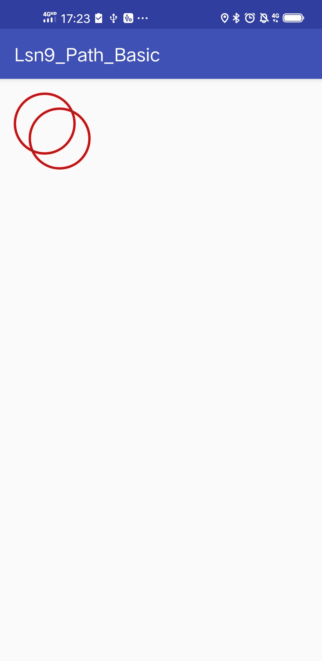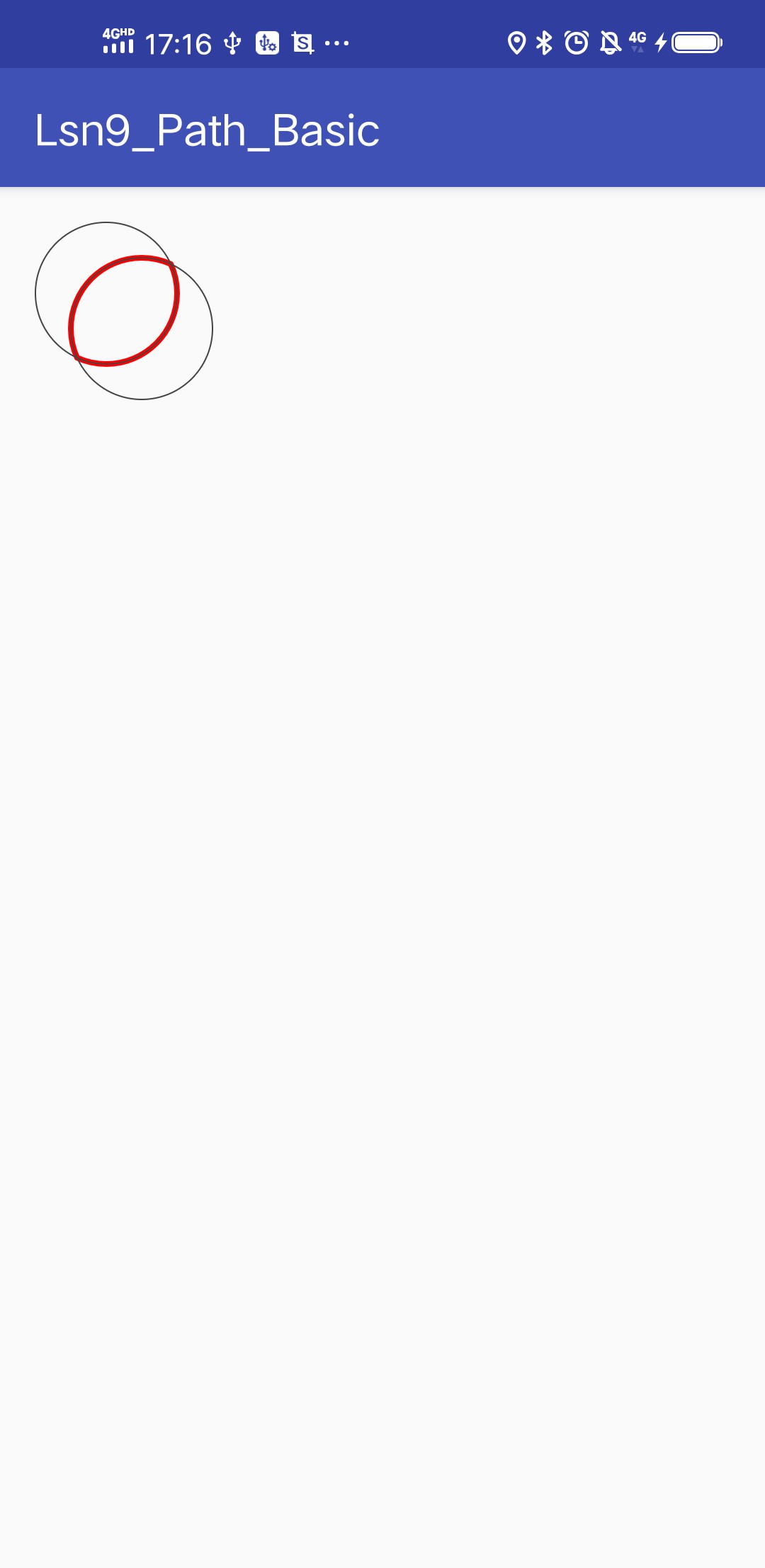 最终效果图如下:其灰色表示最初的2个圆path,红色表示经过Path.Op.DIFFERENCE模式合并后,剩下的path1部分。