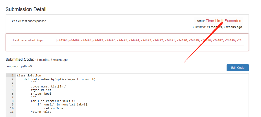 我们知道,Python中list对象的存储结构采用的是线性表,采用 in 这样的方式查询元素的时间复杂度是 O(n),上面的程序总的时间复杂度是O(n*k)(n表示数组长度),因此在给定的数组比较大时,会导致超时,其消耗的时间也就在于查询元素。