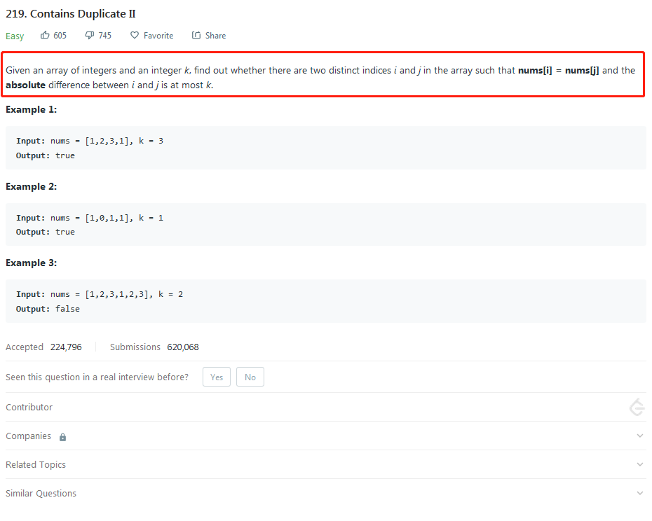 题目很简单,理解起来也很容易,给定一个数据nums,判断是否存在这样的k索引i和j,使得nums[i] == nums[j] 且 j - i >= k,nums,k为给定的值,0<=i<=j < length,理解意思之后很容易就写出这样的代码: