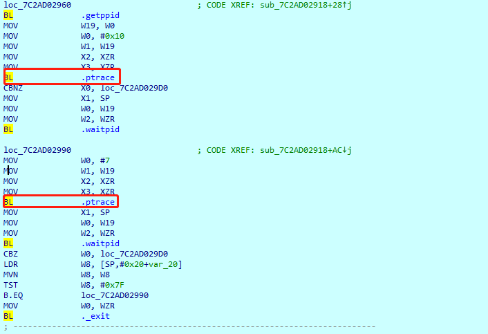 可以看到,除了检测 root之外,还会检测 是否正在被调试。如果 像上次一样只修改那个语句肯定不行,被调试检测也得一样修改,要不然在动态调试的时候会直接退出: