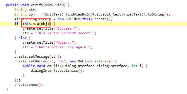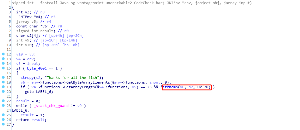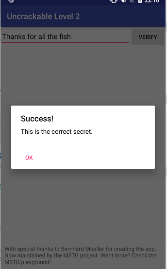 逻辑很清晰,先判断输入的字符串长度是否为23,然后再判断是否与 "Thanks for all the fish"相等,也就是输入的字符串是否为 "Thanks for all the fish",在app上输入该字符串,可以看到成功了: