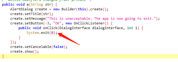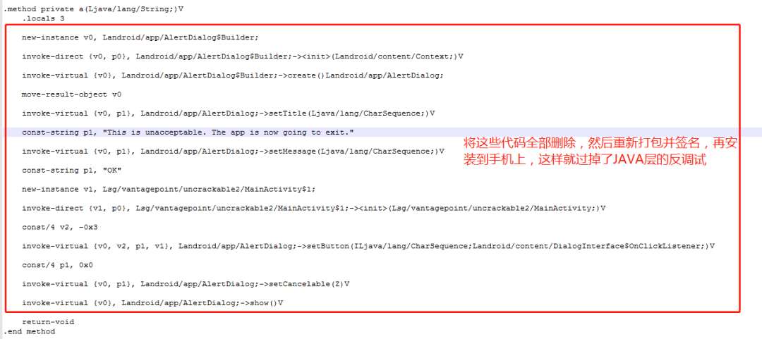 二:将这里的代码在smali文件里面全部删除,这样就不会将程序退出了。