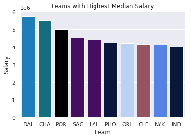 palette=color_order).set_title('Teams with Highest Median Salary')