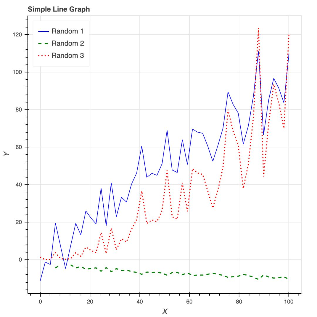 Bokeh 提供的所有便利都要在 matplotlib 中自定义,包括 x 轴标签的角度、背景线、y 轴刻度以及字体(大小、斜体、粗体)等。下图展示了一些随机趋势,其自定义程度更高:使用了图例和不同的颜色和线条。