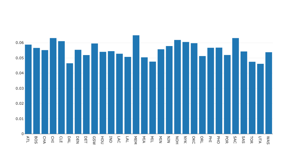 表示不同 NBA 球队每分钟平均失误数的条形图。
