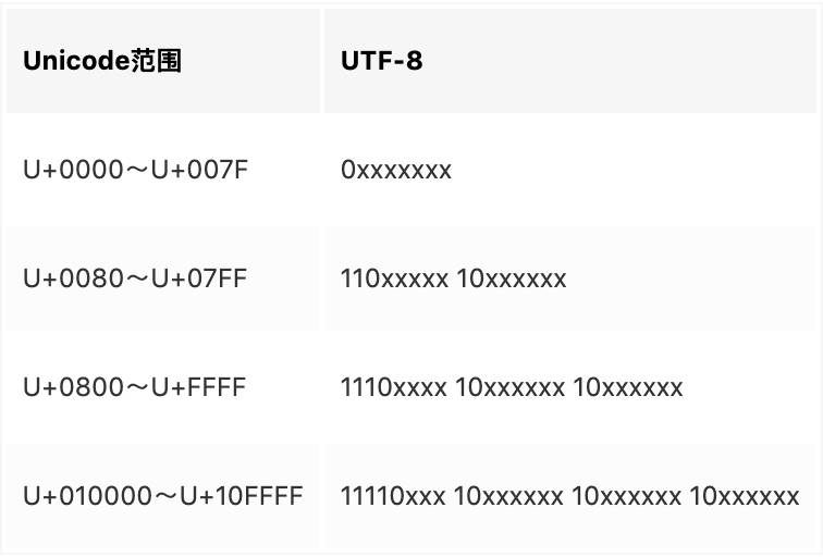 UTF-8 的特点是对不同范围的字符使用不同长度的编码,它可以使用 1~4 个字节表示一个符号,根据不同的符号而变化字节长度。其编码规则很简单: