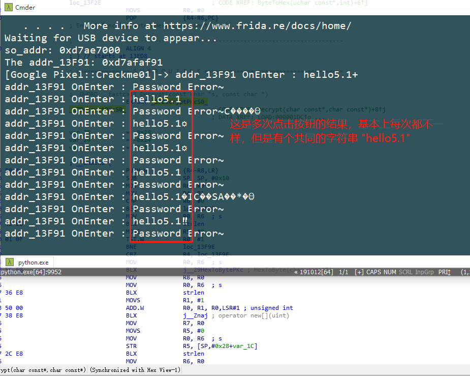 这个时候需要输入字符串,并按下按钮,触发_Z7DecryptPKcS0_函数的调用,随便输入一个字符串,然后按下 VERIFY IT! 按钮,看到frida脚本有输出: