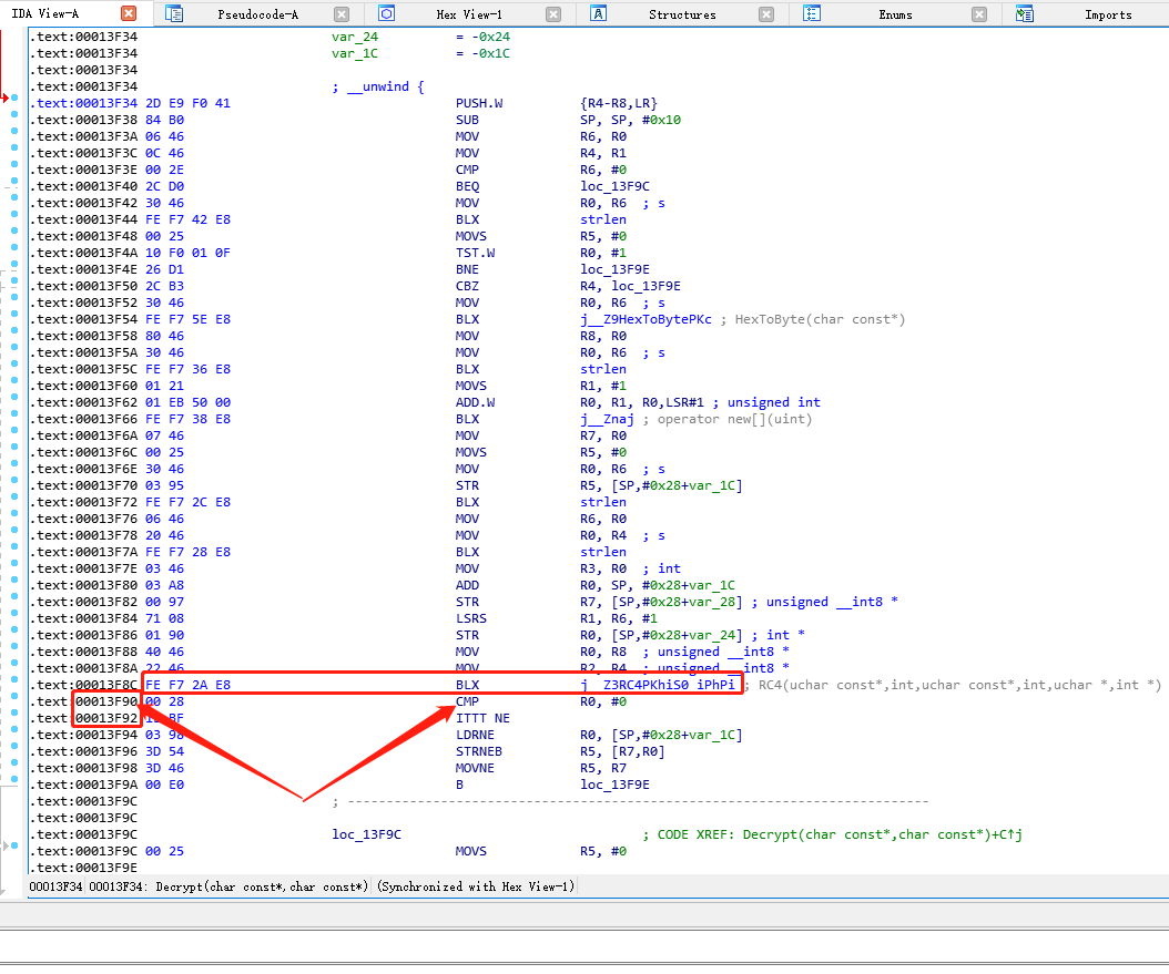 .text:00013F8C FE F7 2A E8 BLX j__Z3RC4PKhiS0_iPhPi ; RC4(uchar const*,int,uchar const*,int,uchar *,int *)