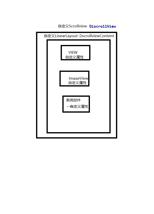 DisScrollview(重写了Scrollview) --->DisScrollviewContent(重写了LinearLayout)--->包含的系统控件。系统控件中类似于app:discrollve_translation="fromRight" 的属性都是自定义属性。现在我们来解释下为什么要重写DisScrollview与DisScrollviewContent以及如何让系统控件如Imageview等来识别我们的自定义属性。