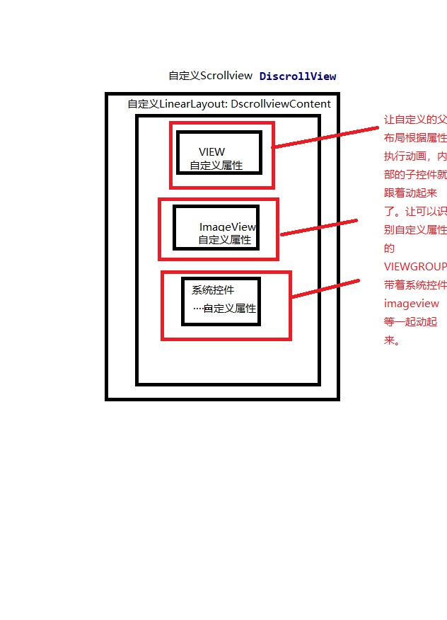 我们可以在imageview外再包裹一个自定义父布局ViewGroup,然后把这些获取到的自定义属性(动画属性值)赋予这个包裹的VIEWGROUP,然后让父布局可以根据属性值来执行动画,那么里面的imageview是不是也就跟着动起来了呢?这个想法应该可以实现,整体布局都执行动画飞了起来,子布局自然就跟着动了起来,相当于我们的系统控件(如Imageview)执行了动画。这是一个瞒天过海的做法,关于如何在LinearLayout addView之前给每一个系统控件包裹VIEWGROUP的事情,就交给了我们自定义的LinearLayout:DisScrollviewContent。这就是我们为什么需要DisScrollviewContent的原因:“”包裹+动画 = 子控件动画 = 瞒天过海“” 现在我们的布局应该是这样子的: