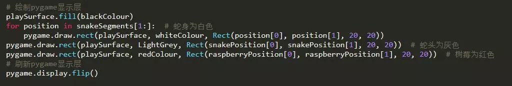 如果蛇头与树莓的方块重合,则判定吃到树莓,将树莓数量清零;而没吃到树莓的话,蛇身就会跟着蛇头运动,蛇身的最后一节将被踢出列表。
