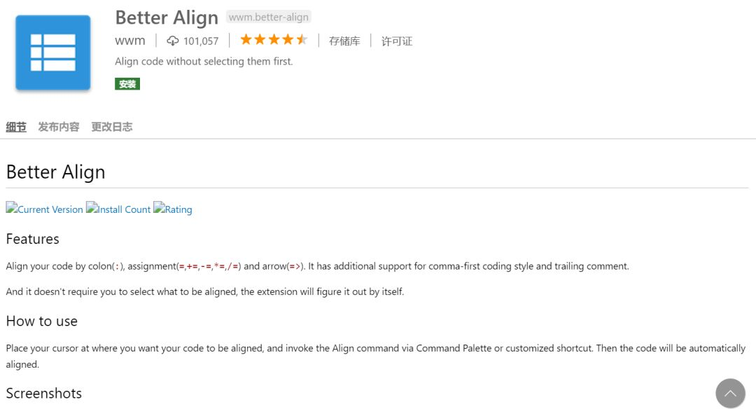 这个就是vscode的对齐插件,启动vscode,进入插件管理,没有安装的话,搜索一下,很快就有了。然后安装即可。vscode的插件管理真是做的很不错,易用。